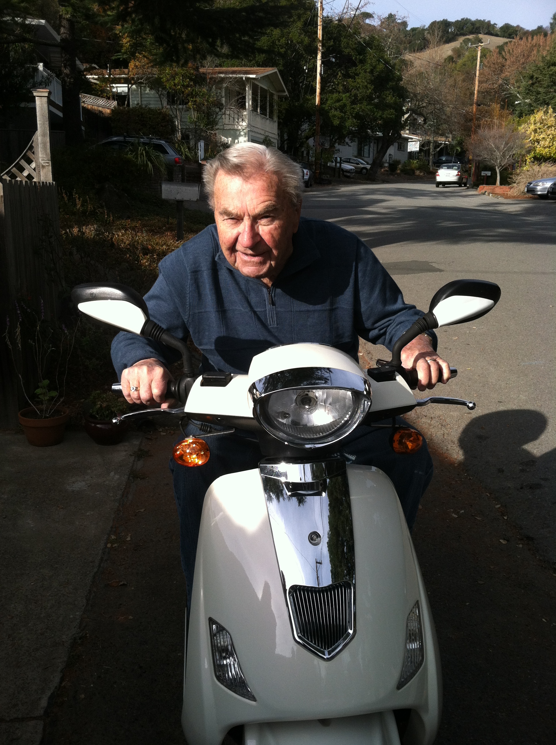 My Dad had some New Year’s Day fun sitting on our scooter and pretending to ride, with the help of my hubby. Of course, if he did ride, he would have worn a helmet! My son edited the top photo, which turned out awesome and our family got a kick out of seeing Grandpa, at the Young age of 94, “cruising down the street!”