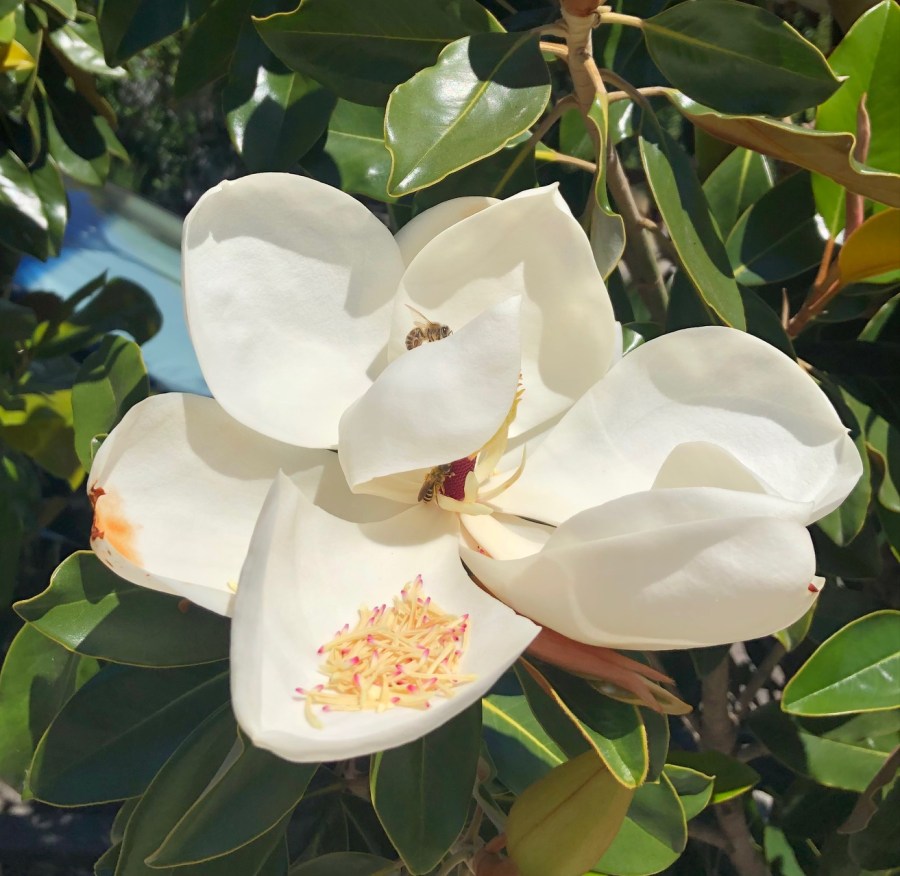 Without bees, we would have no Magnolia flowers. I remember as a child, I feared bees, now I encourage them by planting a buffet of flowers for them. I love the John Muir quote… books and bees – two of my favorite things!