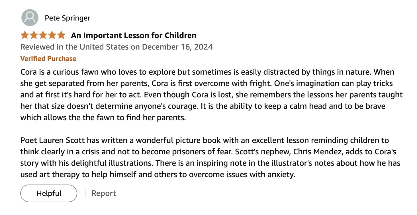 And I appreciate your excellent review of Cora’s Quest. For my first children’s book, I take your words in high regard. Even though her story is short, you are spot on with the message I’m conveying. So, thanks again!