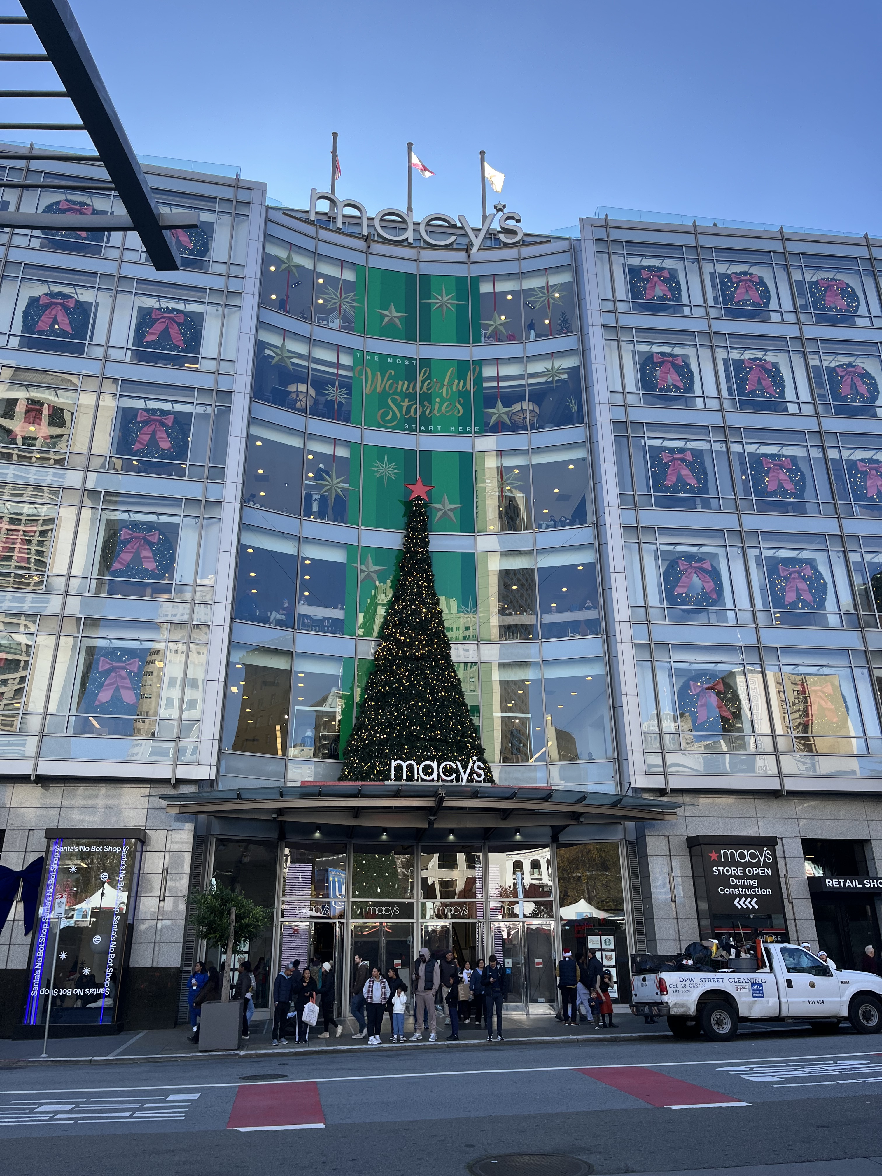 Last Saturday, we went to Union Square in San Francisco for some Christmas fun. What we didn’t expect to see is so many Santas! But it wasn’t random; SantaCon was in full force – a bar crawl in festive Christmas costumes. We also saw many elves and The Grinch and Cindy Lou Who! It was fun to see the sea of reds, whites, and greens. I was so tempted to ask a few ‘Santas’ if I could take a photo but chickened out. Watching children ice skate evoked wonderful memories of taking our son and daughter when they were little. Precious memories! After several hours of walking around the Square and lunch at The Cheesecake Factory in Macy’s on the eighth floor, we headed for The Embarcadero to take in the hustle and bustle in The Ferry Building. I couldn’t resist photos of the festivities in general, so here we go: