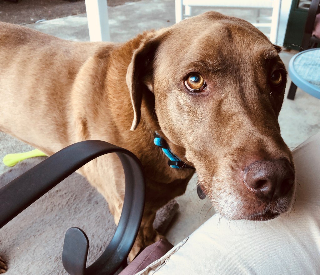 Hi! I’m Copper! Humans call me a chocolate lab mix. My legs are tall and my belly is shaped like a barrel. I hear I’m a big boy, weighing about 80 pounds, but I’m all muscle. I got my name because my coat is the color of copper like the metal. Humans often tell me I’m handsome, and if dogs could blush, I would blush. I love to cuddle and roll around the floor on my back, and my family gets to rub my barrel belly as often as they want. You see, I’m very generous, but my biggest job is to protect them.