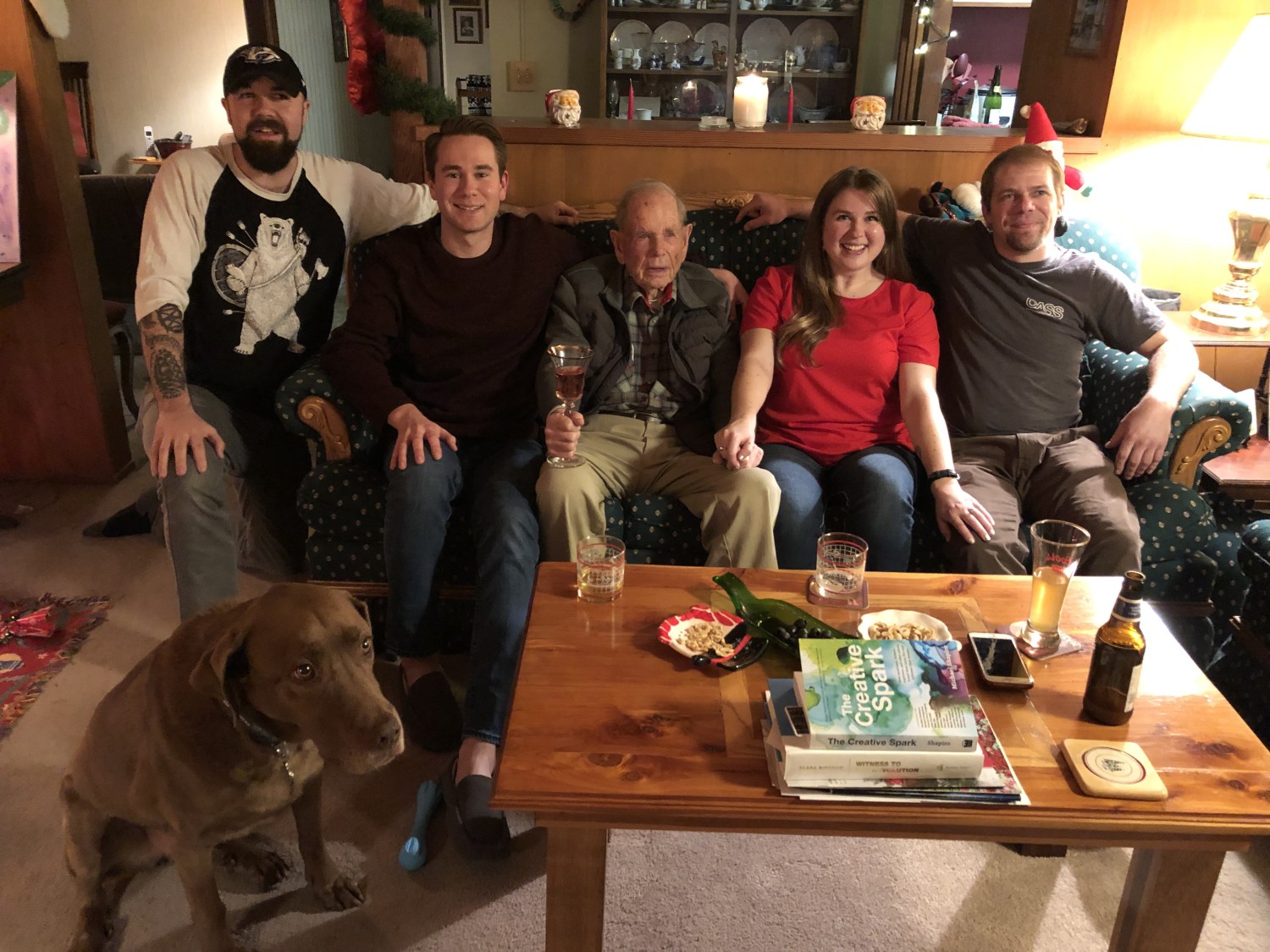 This photo was taken 4 years ago. My father-in-law sits in the middle with my son and daughter on each sides, and my daughter’s husband on your far left next to my son and my nephew on your right next to my daughter when you’re looking at this. Of course, Copper had to join in, too. So, Wil was 95 here and he’s now 99 1/2!