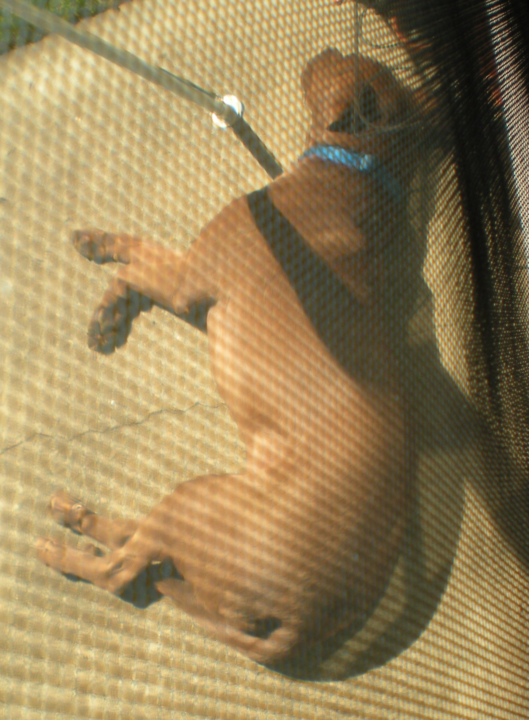 After Rusty and his mom return home from their walk, he is ready for a nap. Exhaustion has taken over his body, not only from the walk and jog, but from the sadness weighing heavy on his heart. In the backyard, a patch of grass in the sunshine beckons him, so he lies down on his side, legs stretched out, and begins to soak up the sun’s warmth. It takes a lot of effort for him to ignore the gloomy thoughts, so he tries to dream of chasing squirrels. But then he hears a loud commotion in the front of the house!