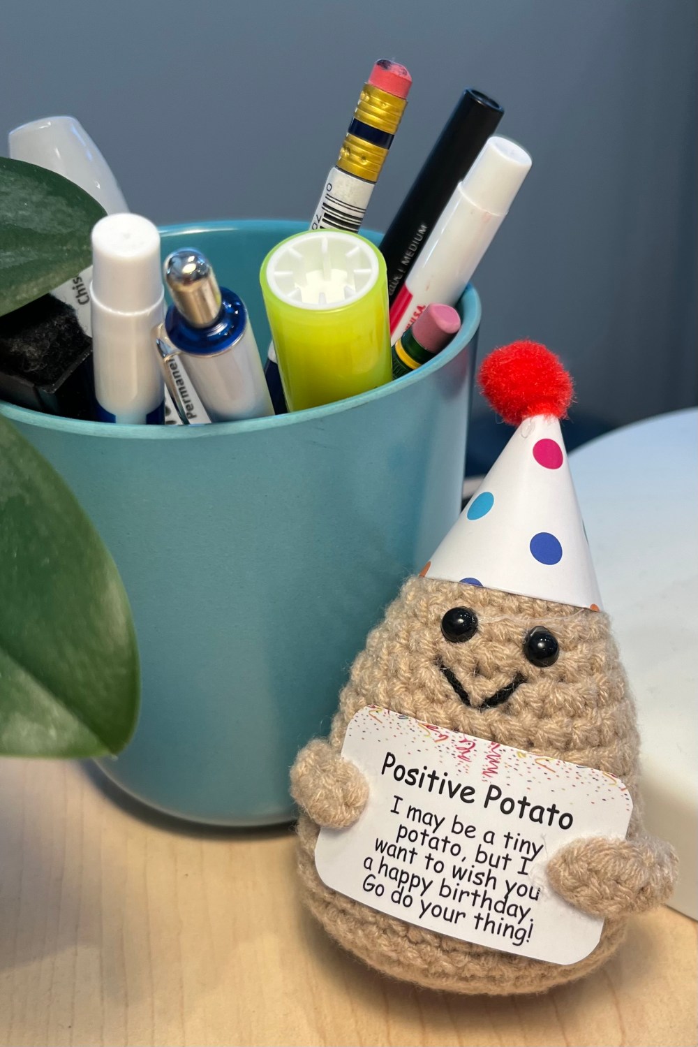 This positive potato is a tiny little guy with a big smile and round, black eyes. Have you seen him before around town or in a store? On a spring day is when we met, a moment I’ll never forget. He lifts spirits if they are low making things bright and all aglow. He’s a simple potato without complications, and he never asks for any explanations. I actually enjoy his company, his jolly, friendly vibe – better than any med a doctor would prescribe!