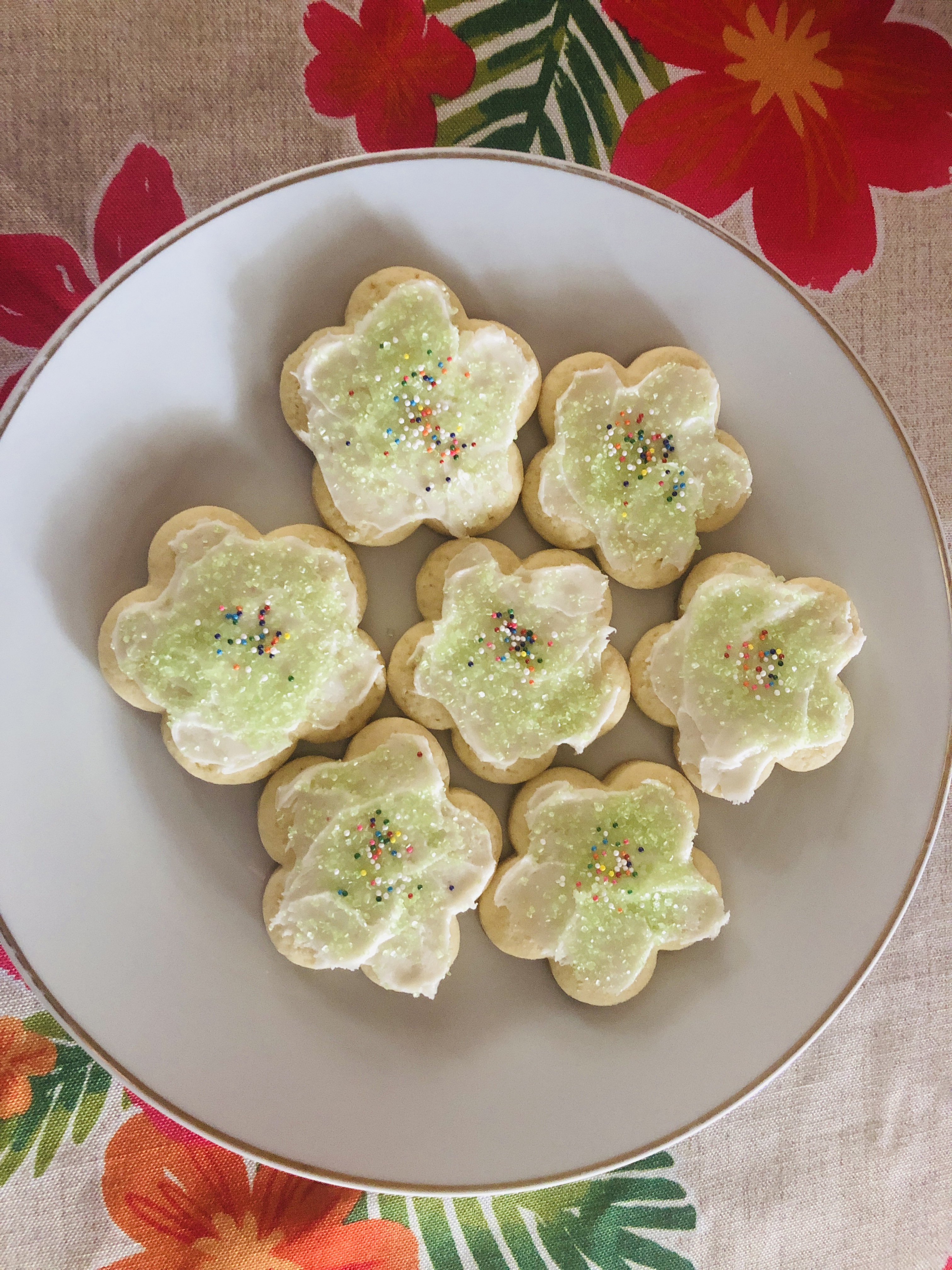 Bunnies, flowers, butterflies, and chicks! What more do we need, except, Love, Love, Love?! Oh, and do you see those white carrots with the green tops or fronds, as they are called? Well, I forgot orange sprinkles, so they turned into white carrots. Yes, white carrots do exist and they’re called, Arracacha, an Andean root vegetable. My son said that the carrot cookies look like feet. I didn’t see that then, but I can see it now. ๐
