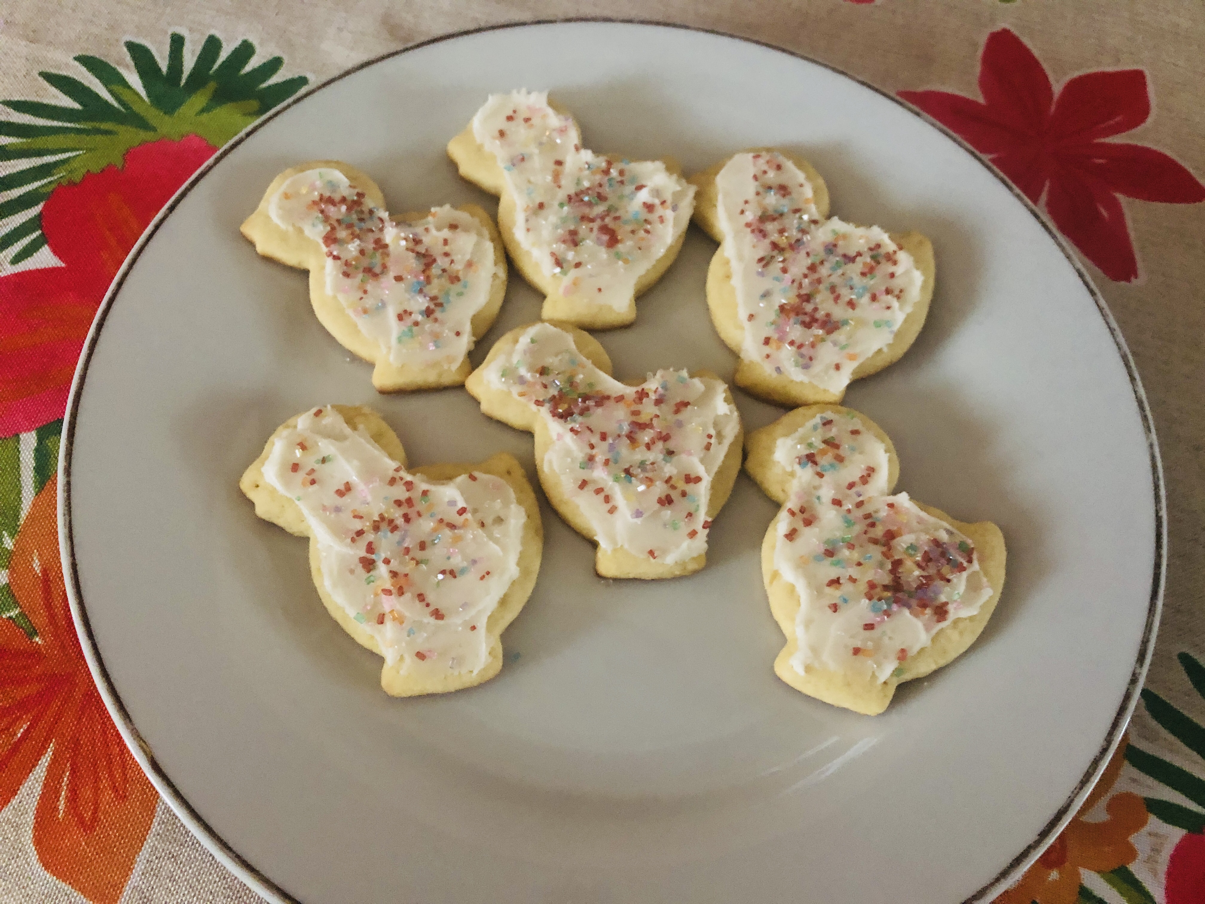 My faithful red hand mixer has treated me well, so no need for a giant mixer in my kitchen. Butter, white sugar, eggs, vanilla, flour, and baking powder waited for their cue. Once the cookies were baked, I mixed up creamy buttercream frosting: more butter, powdered sugar, a little milk, and vanilla, and voila! So good! When the cookies were cool, I frosted them then I added colored sprinkles for decoration. Some bakers paint their cookies, but I like to sprinkle. And here’s what my kitchen looked like: