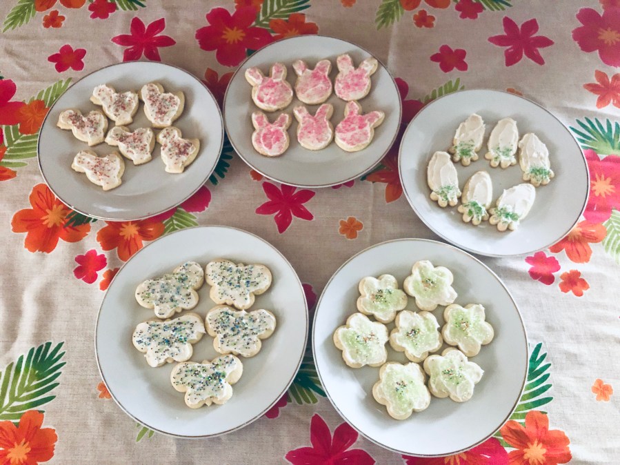For Easter, I decided to do some baking, so I pulled the recipe card out of my recipe box for my mom’s sugar cut out cookies. I have wonderful memories of baking with her when I was a young girl. I continued that tradition with my daughter and son, but now that they live on their own, I bake solo. In the past, I’ve used Cross cookie cutters for Easter, but this time I bought some that are fun for both spring and Easter.