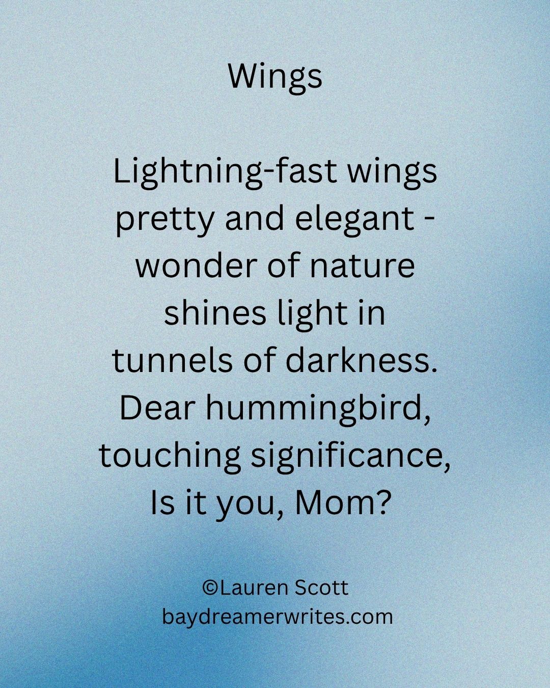 A little more context regarding the rules…each poem had to be eight lines only (poetry with meaning and brevity), and could be written about any topic. I’m sharing “Wings” below: